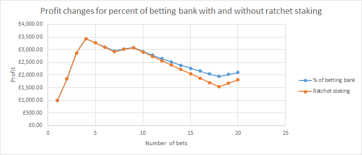 Example table shows how betting bank of £1,000 and stake change with and without ratchet staking option. At chart we can see how betting bank increased after several good results, and then it started to fall when series of losing bets occurred. In this case ratchet betting bank went down a lot faster than regular betting bank. Attached is also worksheet that you can use to test different scenarios and see how your betting bank would change for different bets and odds.